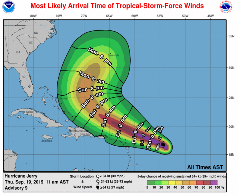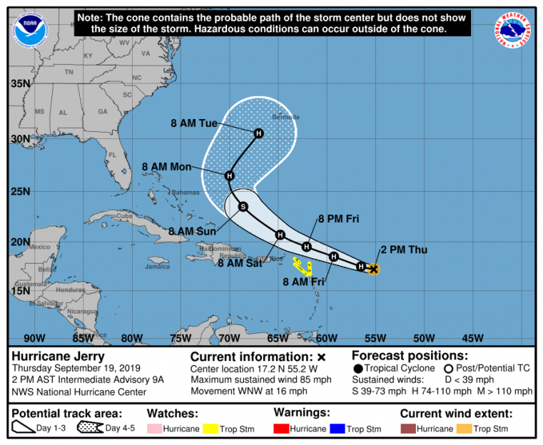 Hurricane Jerry is on a west-northwesterly track and on a course to pass well to the north of the Leeward Islands on Friday. Some gain in strength is possible in the meantime. Tropical storm conditions remain possible for portions of the Leeward Islands and tropical storm watches are now active. Over the longer term, Jerry is expected by the NHC to make a slow turn to the north and northeast early next week, although the timing and placement of this turn remains uncertain. The storm poses a potential threat to Bermuda for next week.