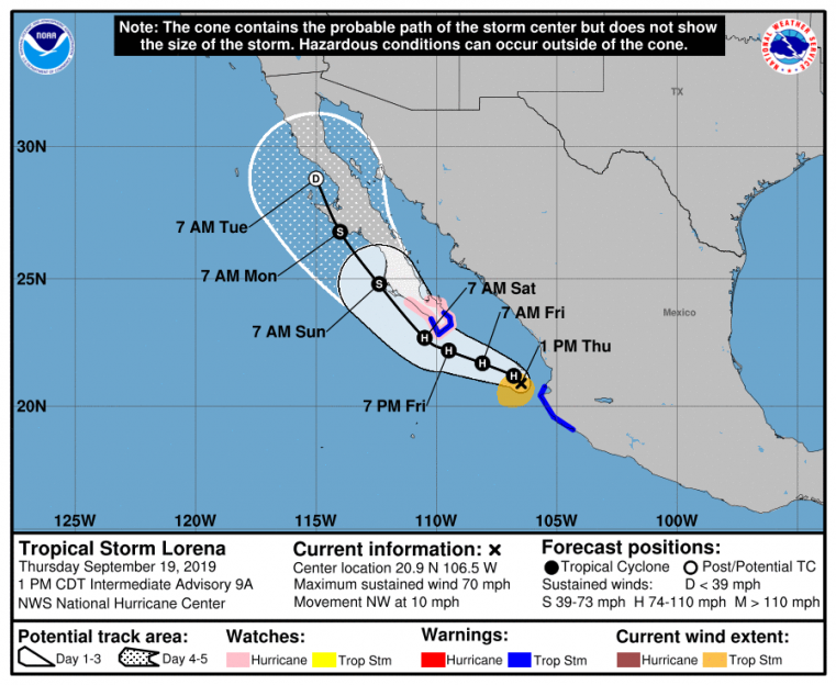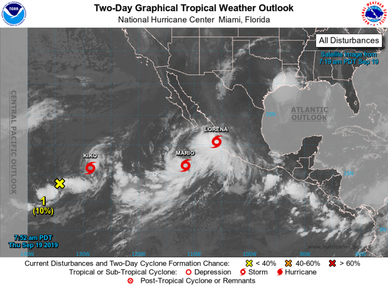 Concerning intensity, recent land interaction has caused Lorena to weaken back to a tropical storm. Warm waters and a favorable upper-level environment should allow Lorena to regain hurricane strength as it approaches the Baja California Peninsula per the NHC. Interaction with nearby Tropical Storm Mario may complicate the intensity forecast.