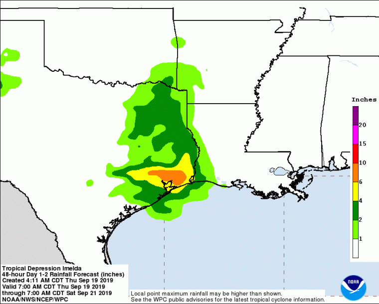 The U.S. Weather Prediction Center (WPC) continues to follow the remnants of Imelda this morning following the last advisory from the NHC on Wednesday. After making landfall as a minimal tropical storm on Tuesday, Imelda quickly weakened to a Tropical Depression. As of Thursday afternoon the very slow moving system was loosely organized to the north of Houston, however rain bands extend to the coast from Houston, Texas to Jennings, Louisiana. The bands of the system have produced an active tornado threat for affected areas and tornado warnings are still being issued for areas under immediate threat.