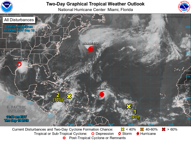 Tropical activity continues for the North Atlantic and East Pacific Basins. A few features continue to pose an active threat for property. Tropical Storm Lorena is on a track very close to the Pacific Coast of Mexico, after bringing hurricane conditions and heavy rainfall. Meanwhile the remnants of Imelda continue to draw significant moisture onshore over the northwestern Gulf States to produce excessive rainfall and an escalating flood threat. Hurricane Humberto made close approach to Bermuda last night and brought hurricane conditions to the island, and has since cleared the island where conditions are improving. Further south, Tropical Storm Jerry should make close approach to the Leeward Islands and Virgin Islands as a hurricane tomorrow and Saturday before making a gradual turn to the north and northeast early next week.