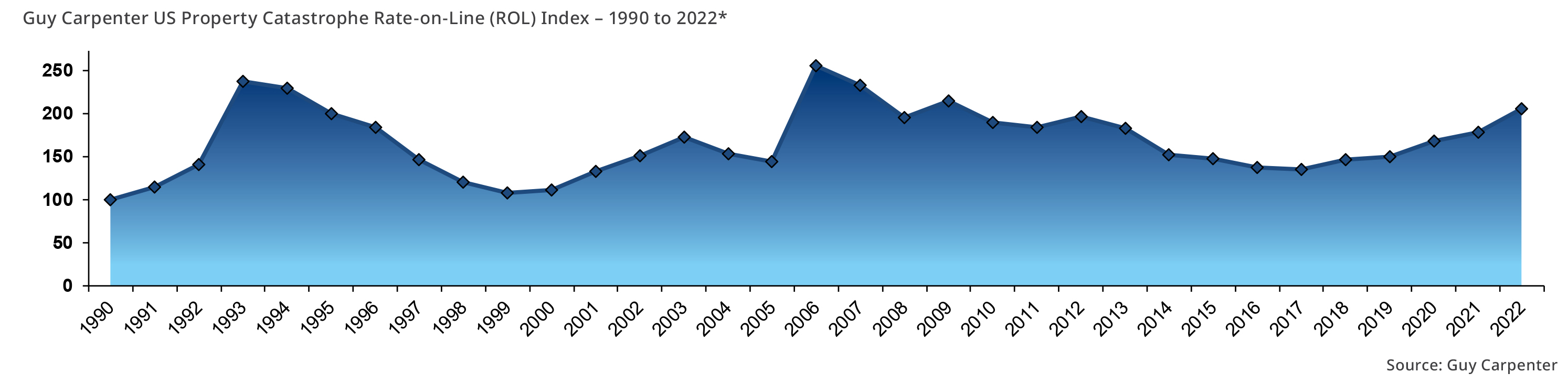 * Guy Carpenter’s US Property Catastrophe Rate-on-Line (ROL) index is a measure of the change in dollars paid for coverage on a consistent program basis. The index reflects the pricing impact of a growing or shrinking exposure base, evolving methods of measuring risk and changes in buying habits, as well as changes in market conditions.
