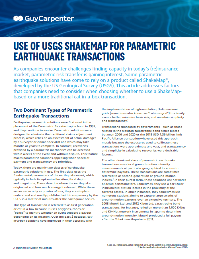 As companies encounter challenges finding capacity in today’s (re)insurance market, parametric risk transfer is gaining interest. Some parametric earthquake solutions have come to rely on a product called ShakeMap®, developed by the US Geological Survey (USGS). This article addresses factors that companies need to consider when choosing whether to use a ShakeMap-based or a more traditional cat-in-a-box transaction.