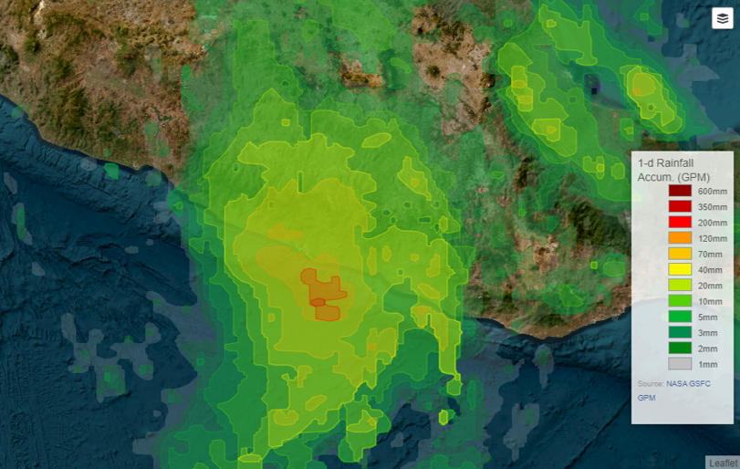 As a quick moving storm with a narrow track, it is anticipated that the majority of insured loss from Otis will be wind driven, rather than from water (surge, heavy rainfall, flooding). However, due to Mexico’s topography inland, localized heavy rainfall from tropical cyclones can often result in landslides and residual flooding, as referenced on page 1. Seen left is a 1-day rainfall accumulation from NASA’s Global Precipitation Measurement Mission (GPM), indicating heavy rainfall produced by Otis.